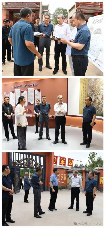调研组一行在广平县人大机关会议室进行座谈,重点听取漳南书院历史文化,县教师进修学校校长赵凤山、县作协主席宋金全、县地方志办公室原主任刘增才分别就漳南书院的历史渊源谈了各自认识,随后深入到漳南书院旧址屯子堡村、国家非遗水陆画展馆、清漳古县及邵雍故里清漳村详细考察,对广平文史工作提出指导意见。